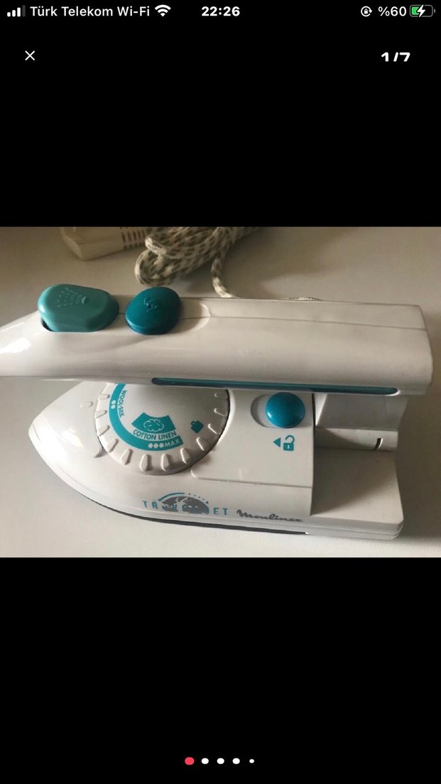 Ayarlanabilir ısı ayarı ve buharlı fonksiyonlu beyaz ütü, kompakt tasarıma sahip, açık mavi düğmeler bulunur.