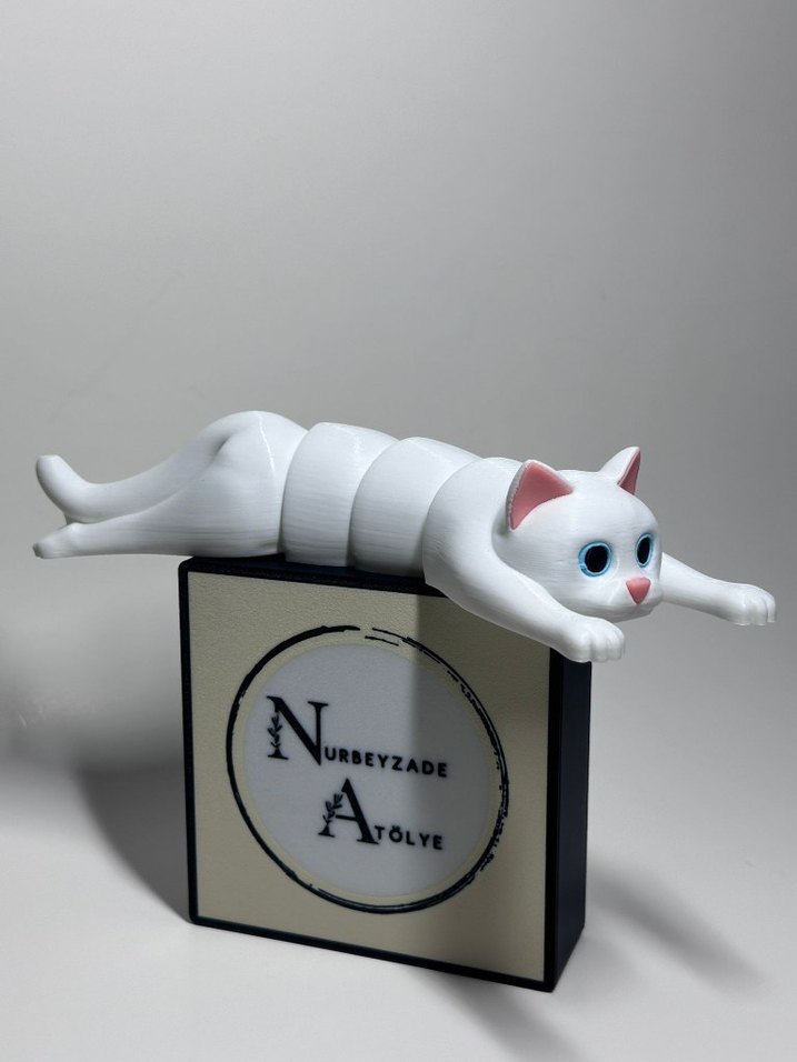 Açılmış pozda beyaz kedi figürü, açık pembe kulaklar ve mavi gözlerle siyah-beyaz kaide üzerinde.