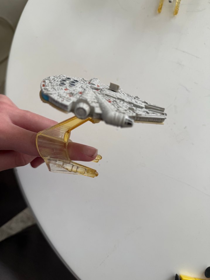 Şeffaf sarı stand üzerinde duran, detaylı tasarımlı beyaz uzay gemisi figürü. Hafif renk tonu özelliklerini ön plana çıkarır.