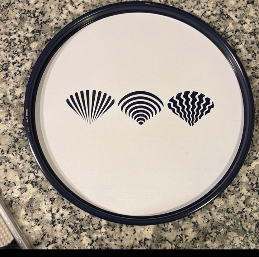 Beyaz zeminde üç farklı siyah deniz kabuğu deseni içeren tepsi. Deformeleri bellidir.