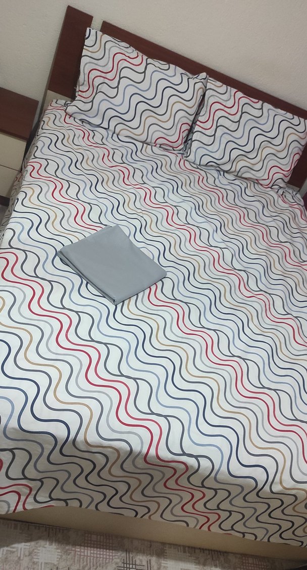 Kendi diktiğim el emeği sıfır ürün Beyaz zemin üzerine gri, kırmızı ve lacivert dalgalı baskı desenli %100 pamuklu fermuarlı nevresim takımıdır. İki yastık kılıfı ve ekstra düz gri çarşaf dahildir. ️ eni.2.05 cm. boyu 2.35 nevresim eni 2.40 cm.boyu 2.49 cm çarşaf. 50 x70 cm 2 adet yastık kılıfı