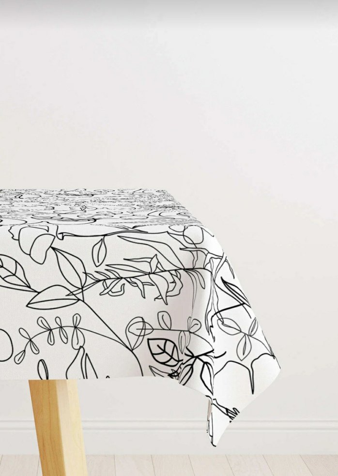 Beyaz zemin üzerine gri yaprak desenleriyle modern tarzda masa örtüsü, yemek alanınıza doğal bir dokunuş katıyor. ️