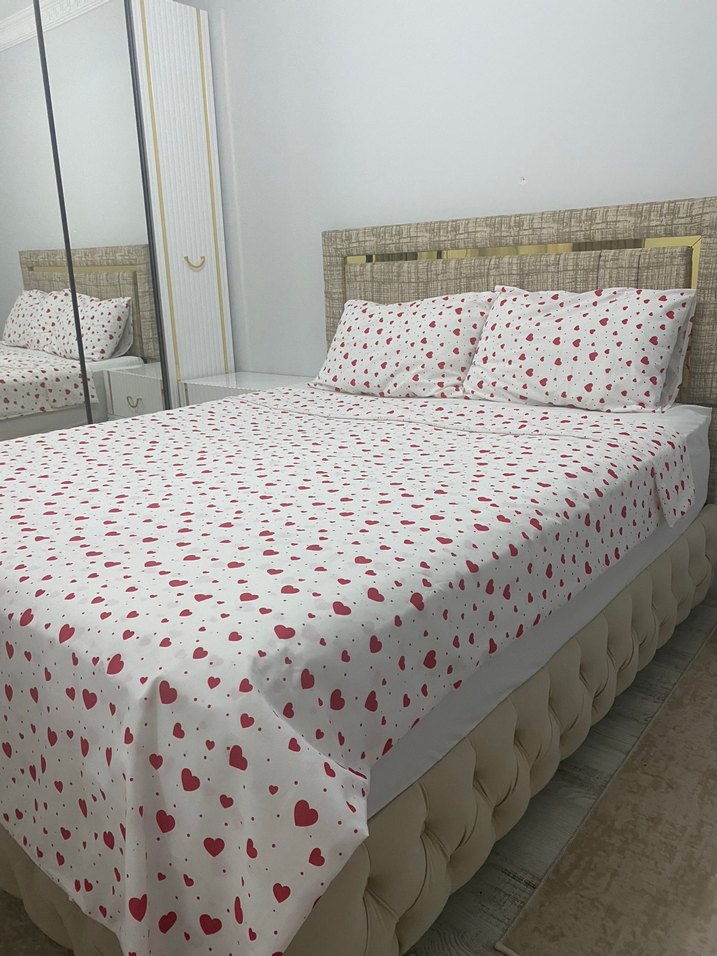 Beyaz zemin üzerine kırmızı kalp desenli nevresim ve çarşaf takımı, yatak odanıza neşeli bir dokunuş katıyor. ❤️ ürün çift kişiliktir ve 160-200 cm bazalara uyumludur 1 nevresim 1 lastikli çarşaf 2 yastık