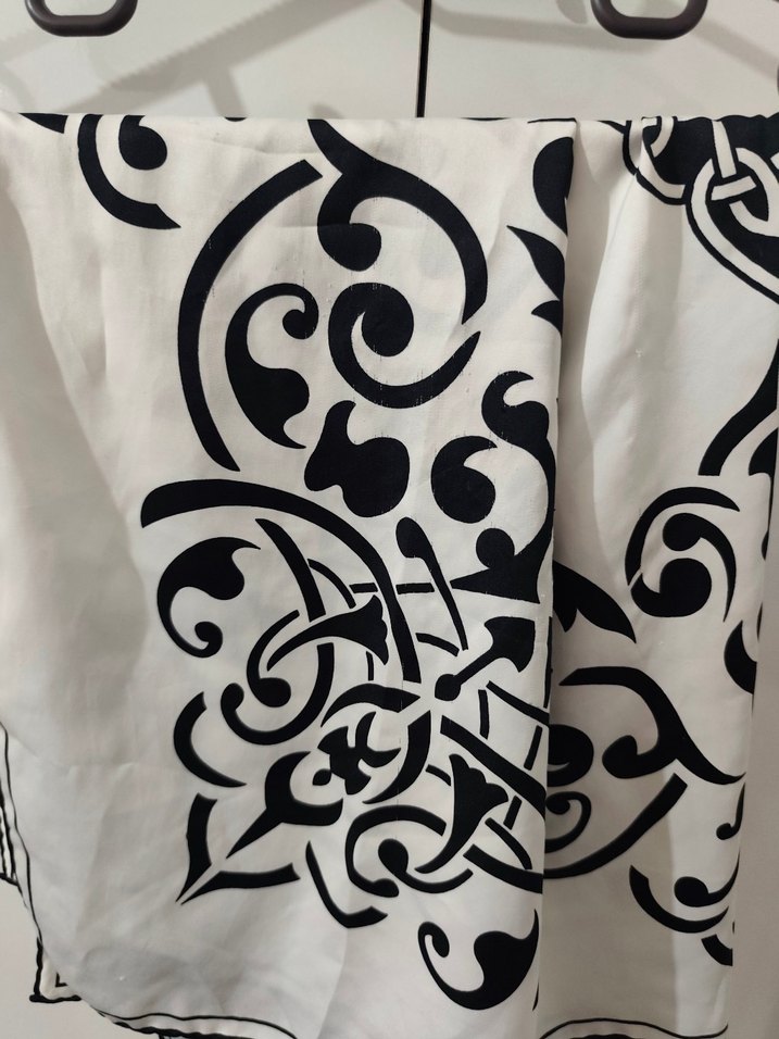 Beyaz zemin üzerinde siyah baskılı desenleriyle bohem tarzı saten eşarp, Kumaşı yumuşak ve desenleri koyu renklidir.