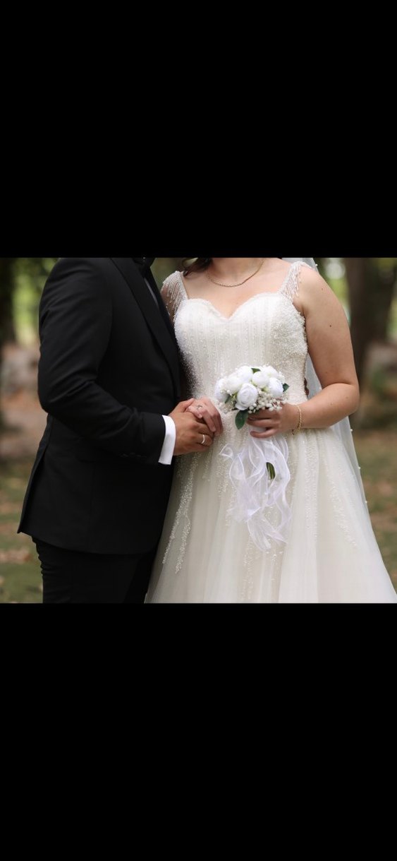 Beyaz, uzun boy A kesim gelinlik. ince askılı, klasik ve minimal bohem tarzı bir arada sunar. tarlatanı malesef bulunmamaktadır. yanında duvak hediye edilecektir. ölçüler fotoğrafta bulunmaktadır. ben 42 beden iken giydim. 44-46 beden için de uyumludur. 1 kere düğünde giyilmiştir sadece.