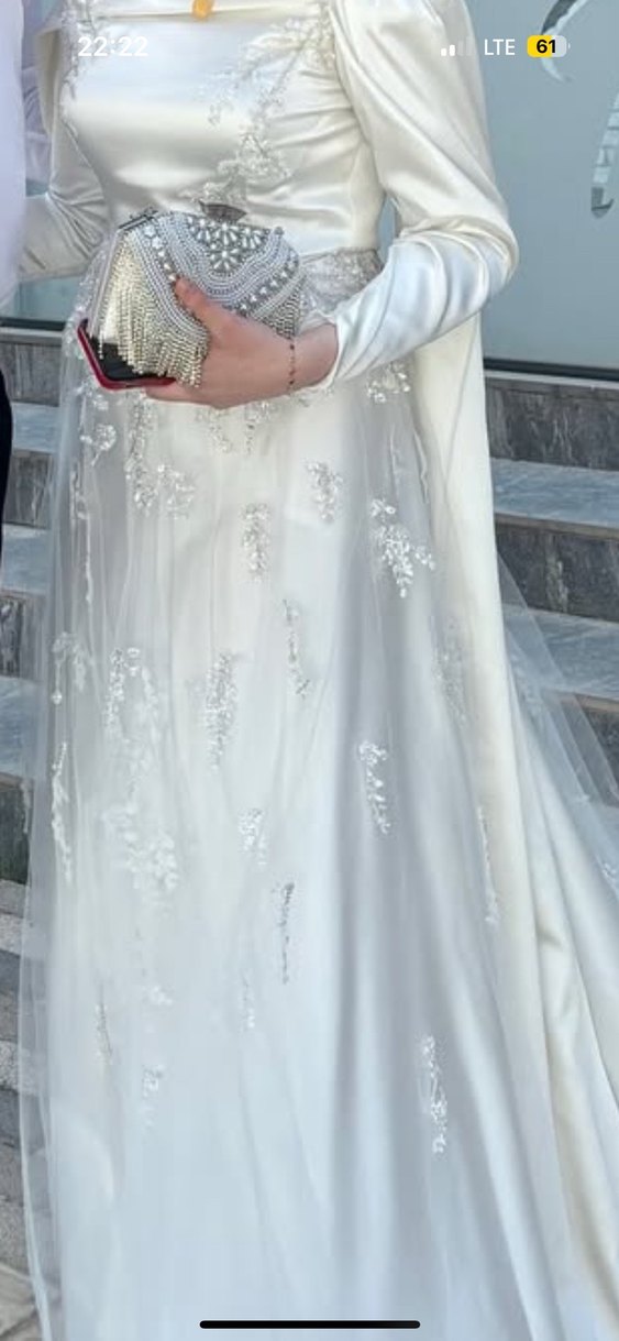 Beyaz uzun A-line gelinlik, straplez yakalı ve ince askılı kollu. Klasik Paris tarzı, düzenli kesim ve zarif çiçek detaylarına sahip.