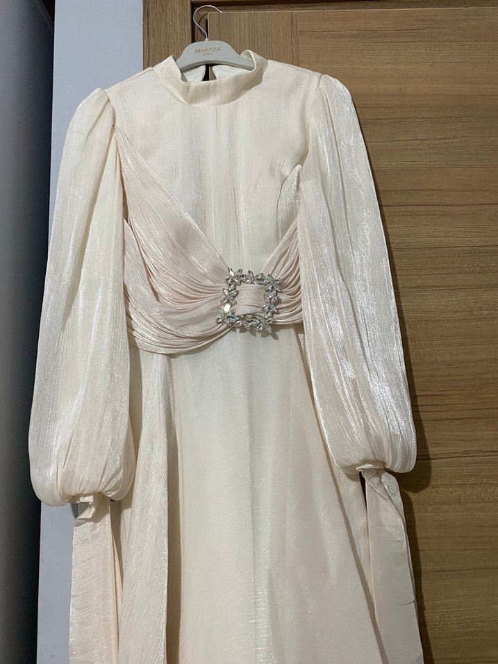 Bu uzun beyaz abiye elbise, drapeli tasarımı, bol kesimi ve askılı kollarıyla dikkat çeker. Kayık yaka ve modern klasik stilde, düğünler için uygundur. (SADECE NİŞANIMDA GİYDİM)