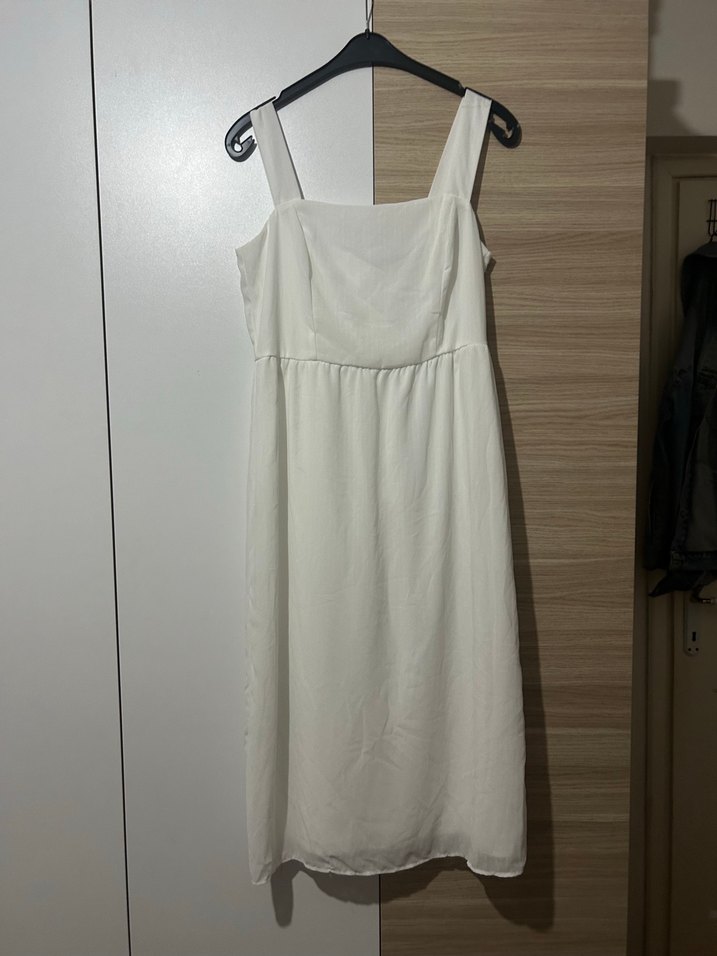 Beyaz uzun elbise, geniş askılı ve salaş kesimlidir. Trendyolmilla marka m beden
