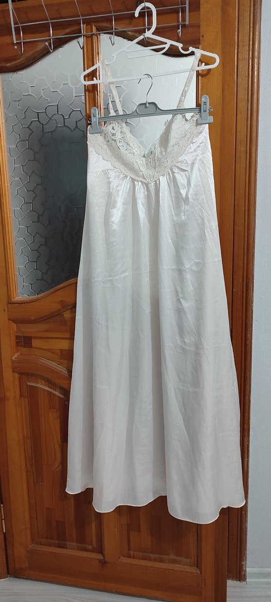 Uzun, bol kesim saten kadın geceliği. Göğüs kısmı 46 cm