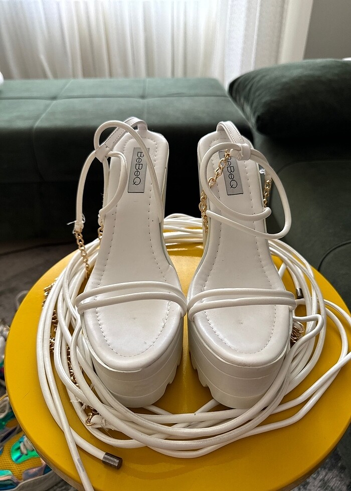 Ürün hiç kullanılmamıştır.Ürün bacak boyunca bağlanabilir uzun bir bağcığı vardır.Yüksek topukludur.