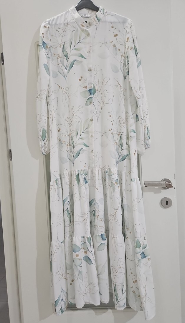 Bu uzun beyaz elbise, bol kesim, yüksek yakalı ve uzun kolludur. Pastel desenli, drapeli bohem tarzda, günlük kullanım için uygundur. yalnızca birkaç kez giydim. 44 42 beden aralığı için uyumludur içine ten rengi astar giyilerek kullanılabilir ben o şekilde kullandım elbisenin boy uzunluğu 140 cm. Kemeri de mevcuttur ayni desende.