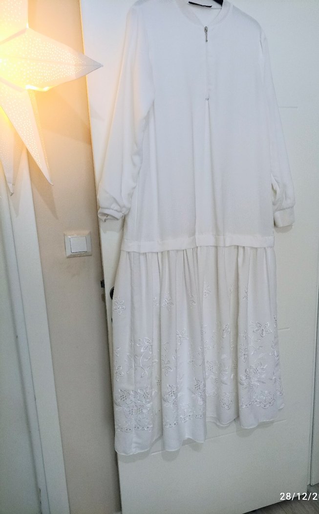 Drapeli ve yuvarlak yakalı uzun beyaz elbise. Alt kısmında ince nakış detaylarıyla bohem tarzda, düğünlere veya günlük kullanım için uygun. Önünde fermuar bulunmakta. Standart beden. Lastik kol.
