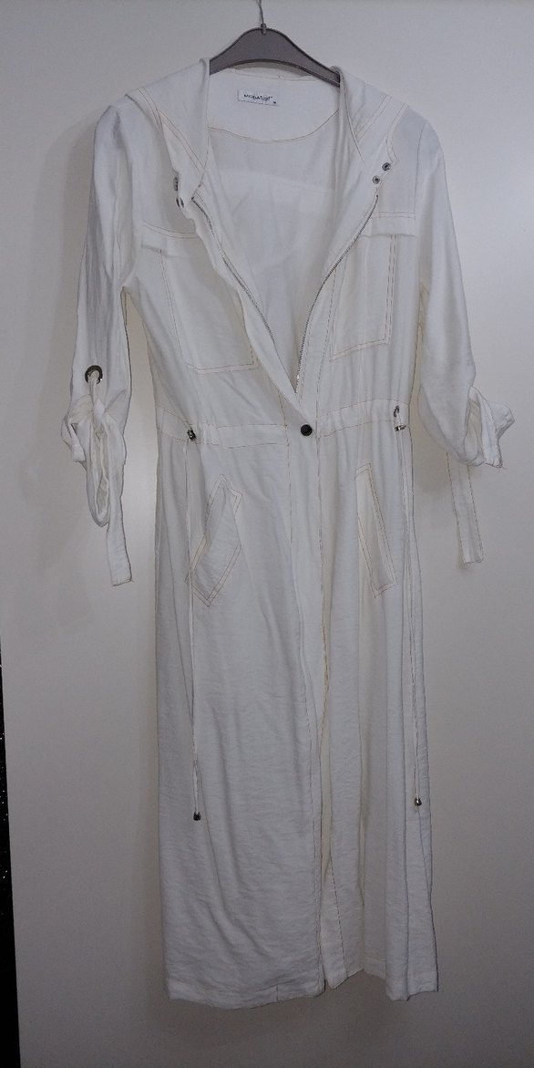Beyaz renkte, uzun boylu ve bol kesim bohem tarzda kadın trençkottur. Uzun kollu ve desen içermeyen sade bir tasarıma sahiptir.