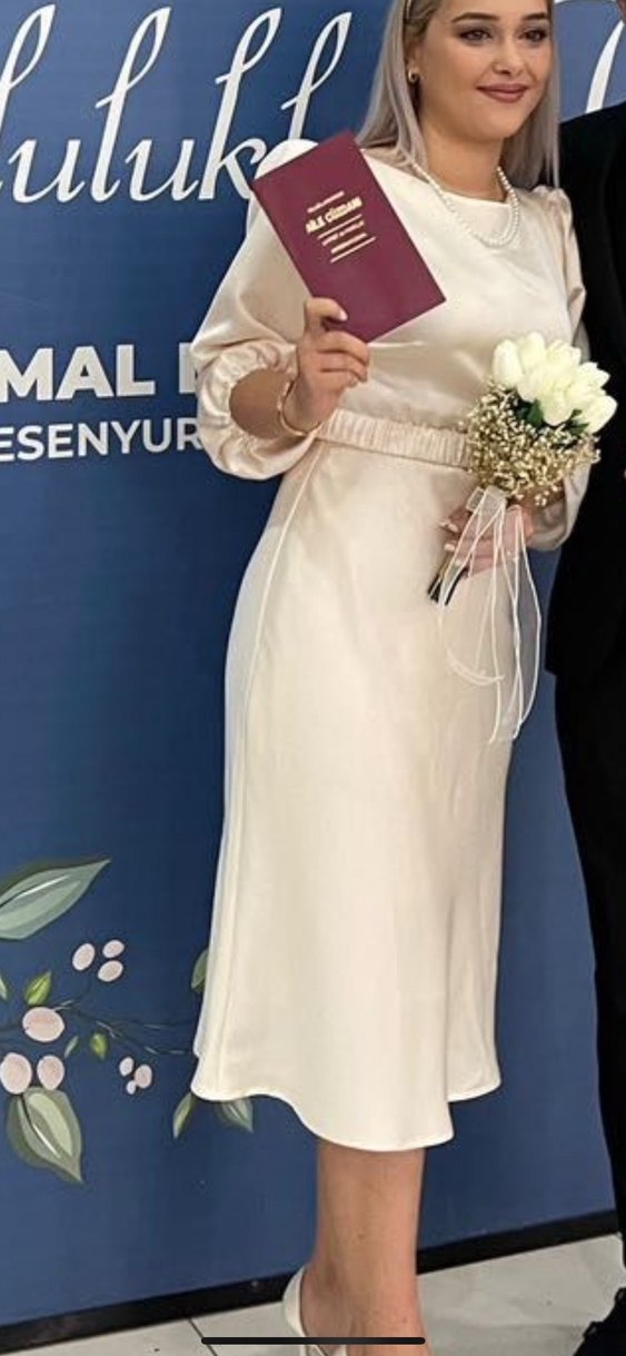 Beyaz uzun nişan elbisesi, midi boy. Trendyoldan almıştım bir kere giyildi hiç bir sıkıntısı yok.