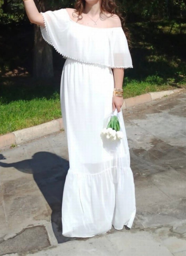 Beyaz uzun elbise, drapeli straplez yakaya ve ince askılara sahip. Rahat kesimi ve yumuşak sentetik kumaşıyla bohem ve retro tarzlara uygun, düğünler ve nikahlar için ideal. icindeki astari kalın ic belli etmiyor inci detaylari el işlemesi