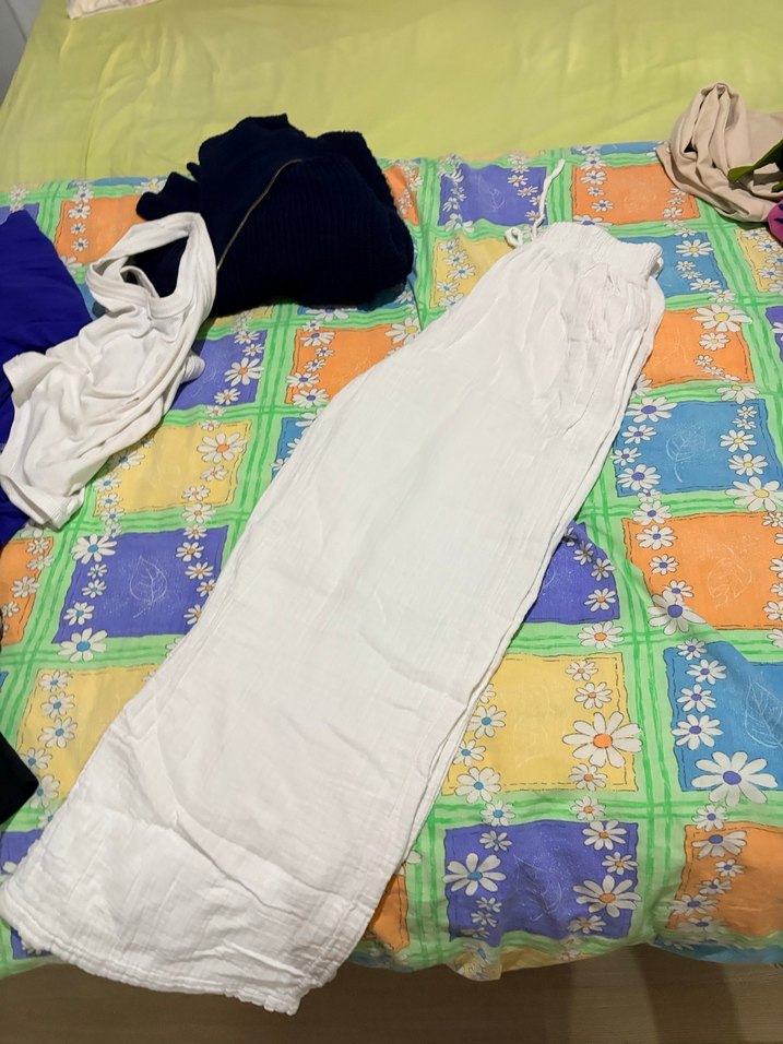 Beyaz keten pantolon, bol kesim ve drapeli tasarıma sahiptir. Günlük kullanıma uygun rahat ve bohem tarzda sokak giyimi için idealdir.