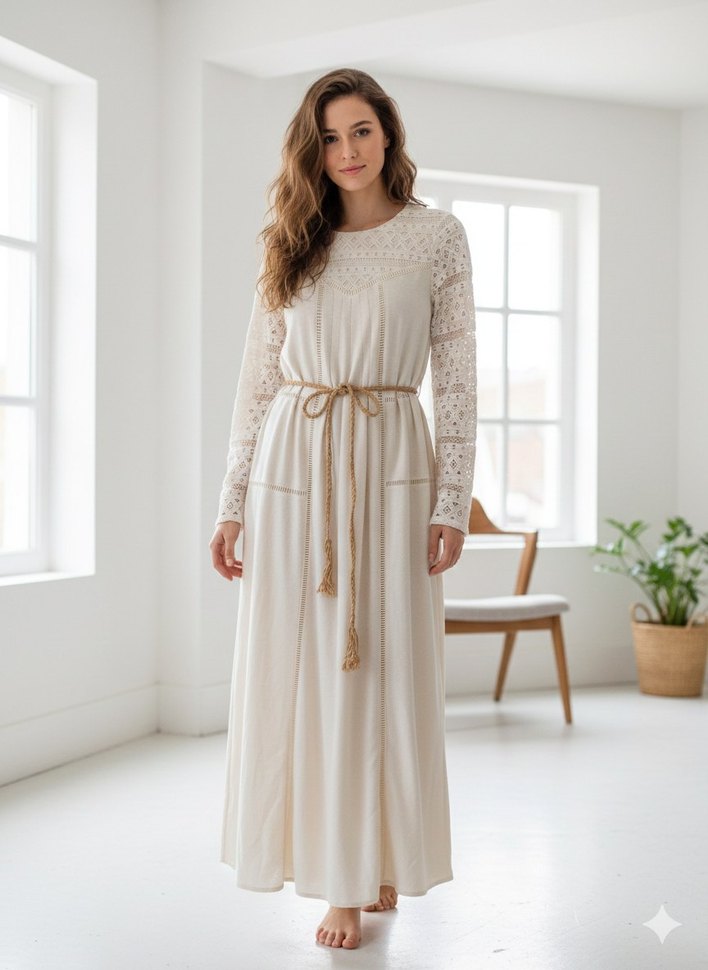 Uzun beyaz elbise, dantel kollu ve işlemeli detaylara sahip. Pamuk kumaştan, bol kesim ve belde bağlama ile, düğünler için uygun. kuşağı var astarlı hennin markalı