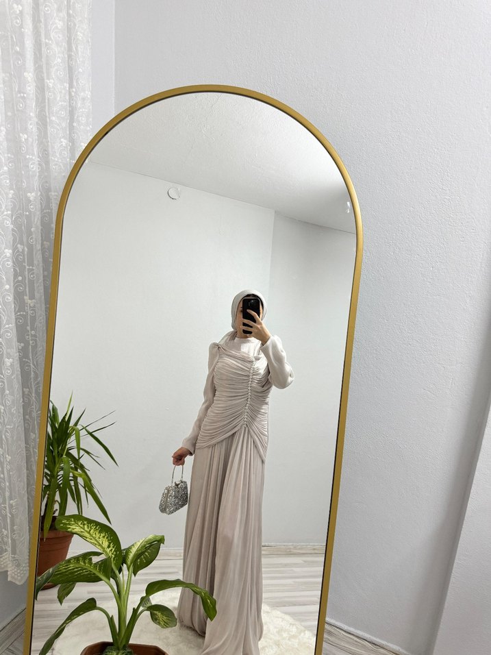 Beyaz, uzun abiye elbise yüksek yakalı ve askılı kolludur. Drapeli tasarımı ve düzenli kesimi ile minimalist stil sunar, düğünler için uygundur.