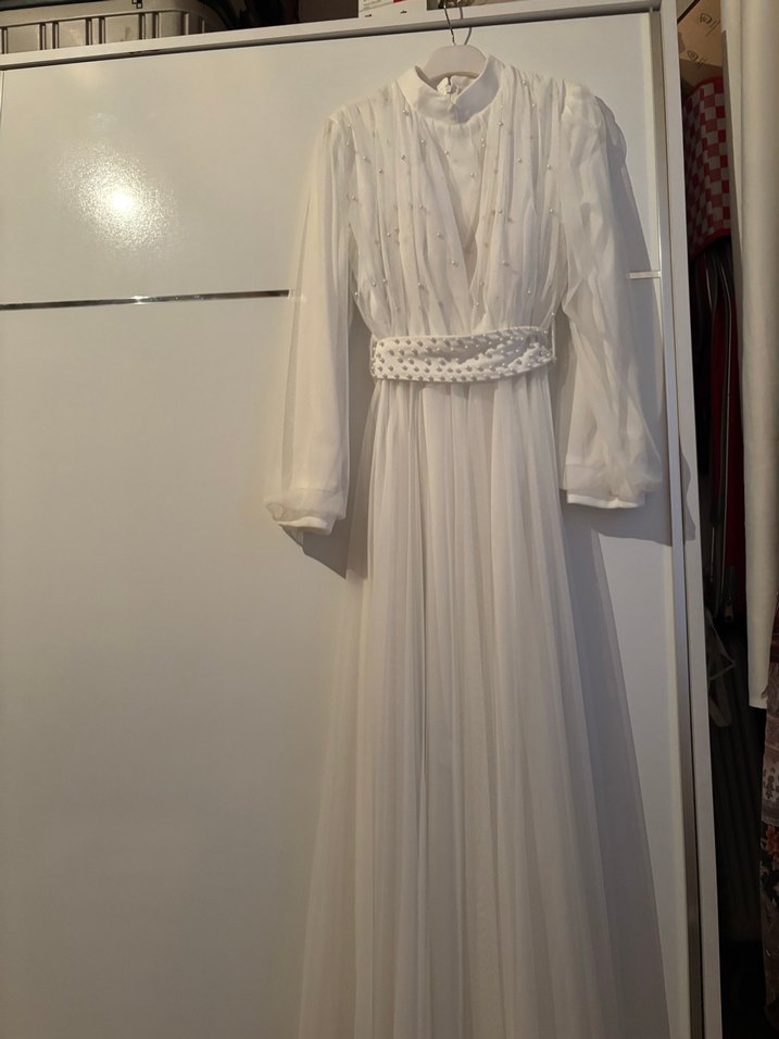Bu uzun beyaz elbise, drapeli tasarımı, yüksek yakası ve uzun kollarıyla yumuşak sentetik kumaştan üretilmiştir. Bol kesim ve klasik vintage tarz sunar. Nikah için uygundur çok şık duruyor