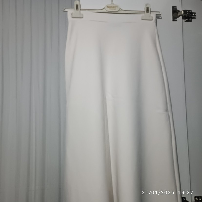 Beyaz uzun, düz kesim ve drapeli tasarıma sahip kadın eteği. Pürüzsüz sentetik kumaştan üretilmiş, minimalist ve desensiz, ofis için uygun.