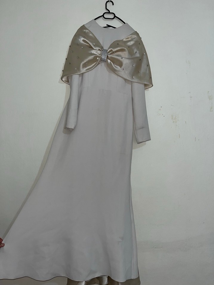 Beyaz uzun ve askısız, kolsuz tasarıma sahip bu gelinlik, incili drapeli detaylarla modern klasik bir şıklık sunar.