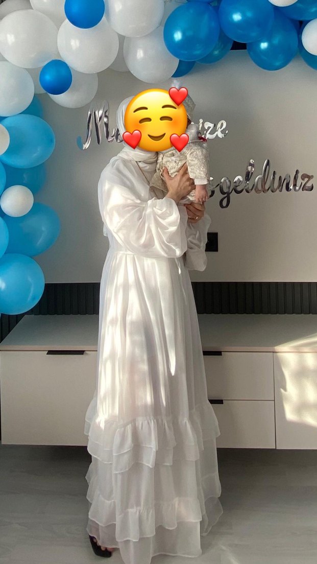 Beyaz Uzun Drapeli Saten Tesettür Elbise