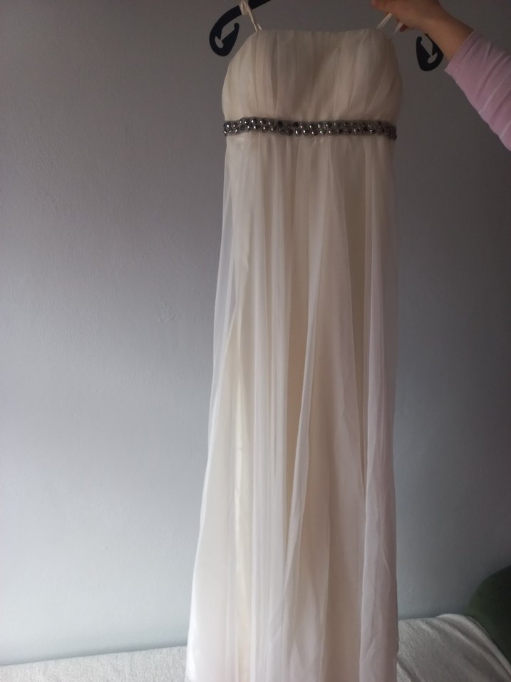 Beyaz uzun abiye elbise, drapeli tasarımı ve straplez yaka ile dikkat çeker. İnce askıları ve boncuklu bel detayına sahiptir, düğünler için modern klasik ve bohem tarzda uygundur.