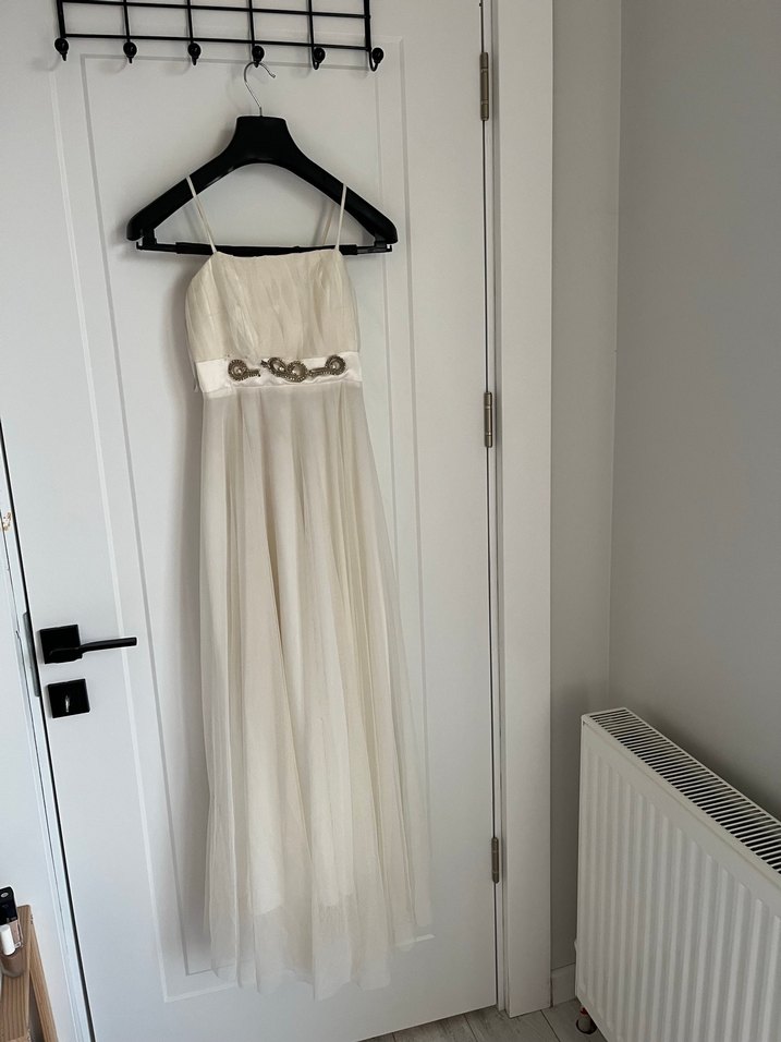 Beyaz uzun elbise, drapeli ve straplez yakalı, ince askılıdır. Vintage esintili modern klasik tarzda, düğünler için uygundur.