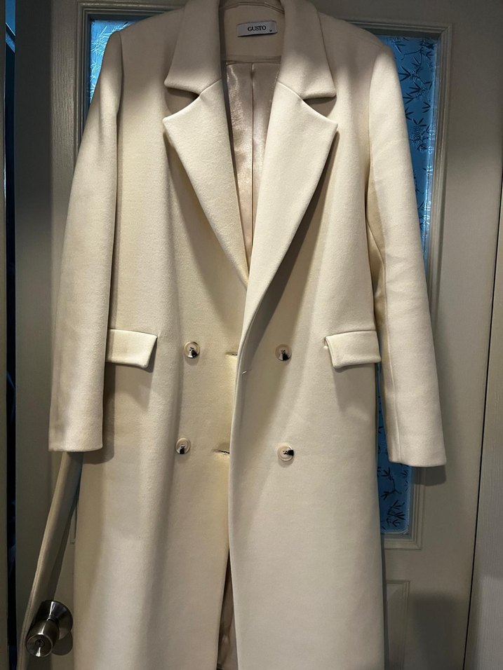 Beyaz uzun kadın kaban, kesik yaka ve düğmeli ön detayına sahiptir. Sentetik kumaştan yapılmış, uzun kollu ve regular fit, günlük sokak stili için uygundur.