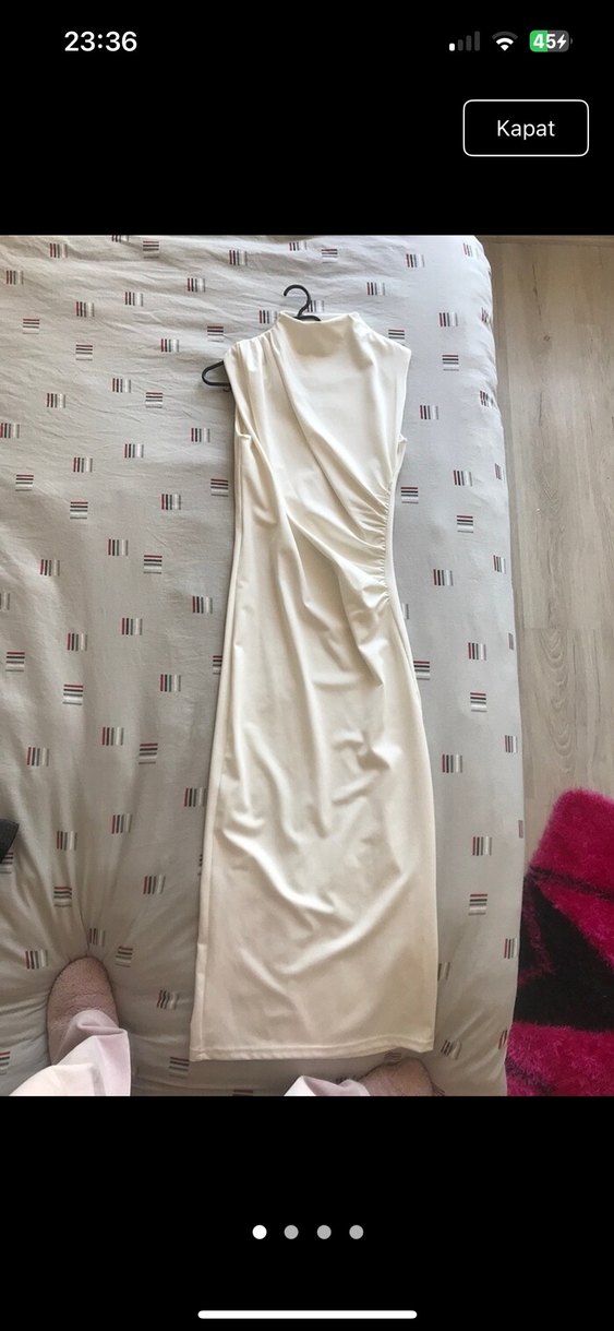 Beyaz, drapeli, uzun ve kolsuz kadın elbisesi, straplez yaka ve vücuda oturan kesime sahiptir. Yumuşak sentetik kumaştan üretilmiş, çağdaş minimalist stile ve düğünlere uygundur.2,3 kere giyildi