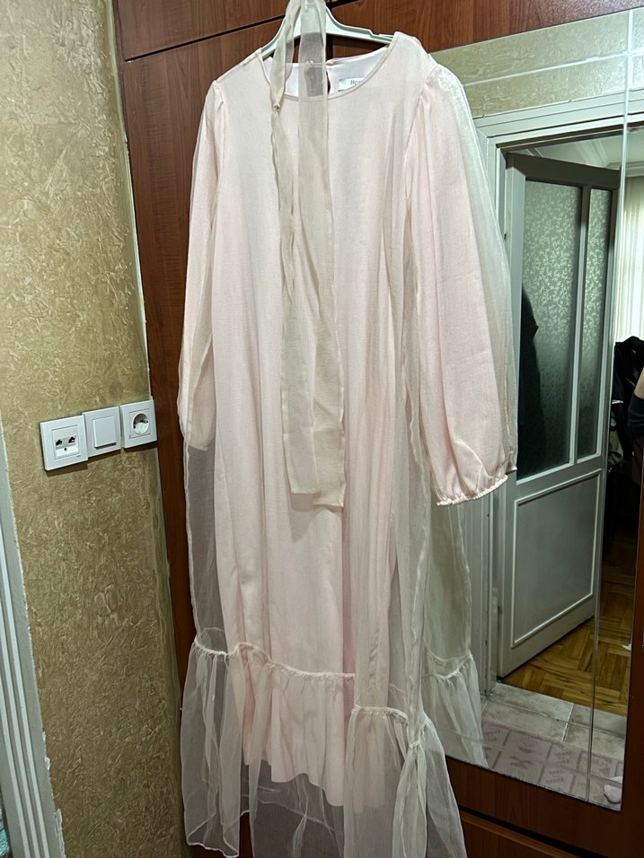 Beyaz uzun elbise, bol kesim ve drapeli tasarıma sahiptir. Halter yaka ve ince askılıdır, bohem Paris tarzını yansıtır. 1-2 kere giyildi