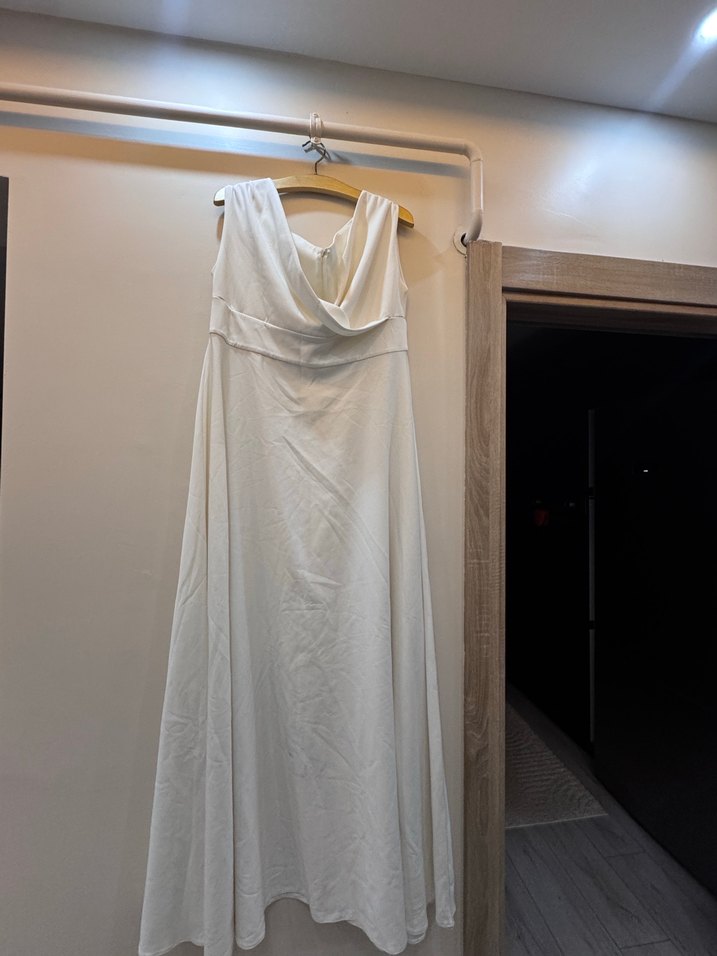 Beyaz uzun elbise, omuzları düşük ve drapeli tasarıma sahiptir. Salaş kesimi ve modern klasik stiliyle düğünler için uygundur. Kolsuz ve minimal görünümlüdür.
