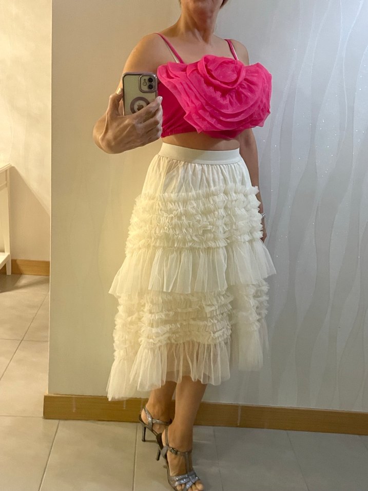 Kayısı rengi (kırık beyaz) uzun etek, fırfırlı asimetrik astarlı beli lastikli YENİ Günlük veya özel günlerde kullanabilirsiniz . Bel lastiği bir yandan diğer yana 35santimetredir toplam bel lastiği 70 santimetredir lastiğin hiç açılmamış ebatıdır 80 90 cm’ye kadar bel ölçüsü lastik açılıp çıkabilmektedir modelin boyu 1.70 60 kg ,eteğin arka boyu topuklara kadar geliyor 70-75 kg’a kadar rahatlıkla giyilebilir
