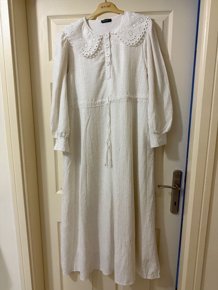 Düğmeli ön kısmı ve nazik işleme detaylı yakası olan, uzun kollu, bol kesim beyaz keten elbise. Günlük kullanım için vintage bohem tarzı.