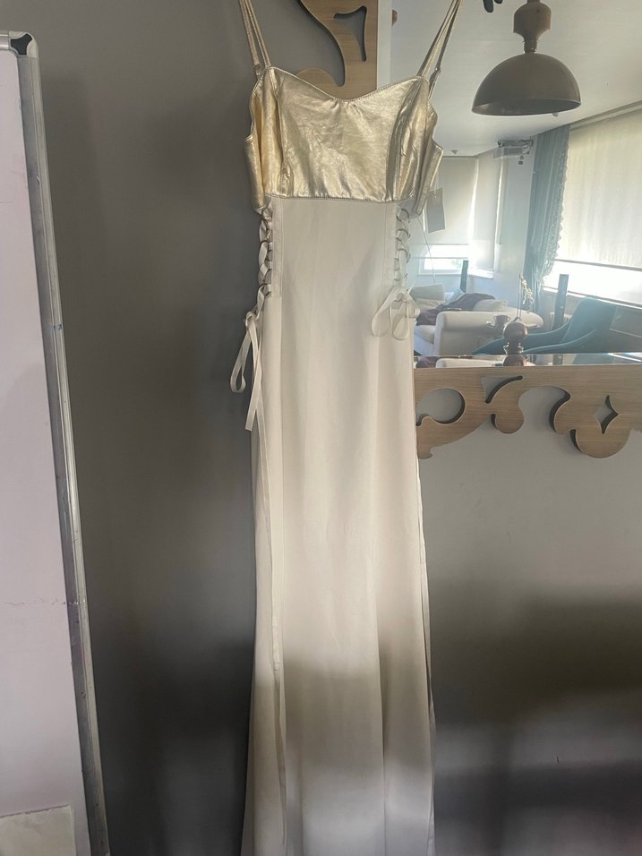 İpek görünümlü, beyaz uzun ve vücuda oturan elbise, drapeli detaylar ve ince askılarla. Straplez yaka ve bohem tarzıyla klasik zarafet sunar. Küçük belirsiz arka kısmında sorun belirtilmiştir ütüyle düzeltilir Y london marka fiyat uygun tutulmuştur