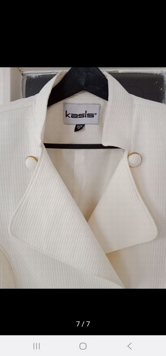Kasis marka, düğmeli, beyaz diz altı blazer ceket. Modern klasik tarzda, strappy kollu, iş ortamına uygun, sentetik kumaştan yapılmıştır. ✨40.42 beden rahat olur kilo aldım giyemedim