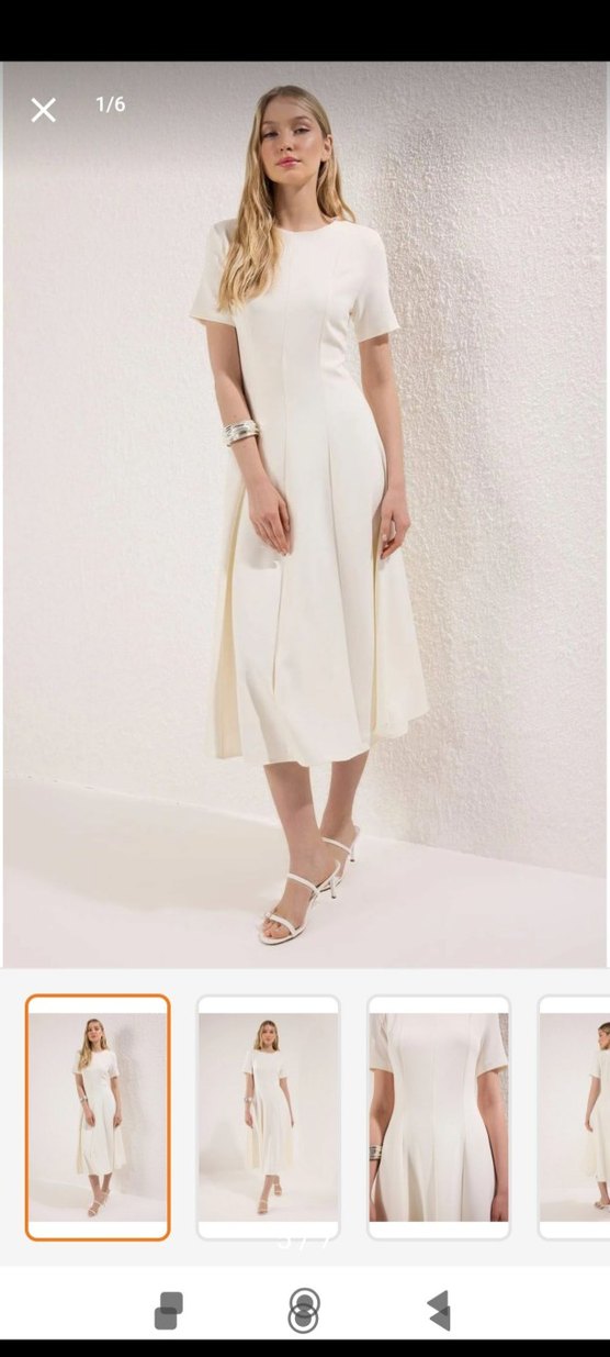 Beyaz uzun elbise, kayık yaka ve ince askılı kollarla. Rahat kesim ve ipeksi dokusuyla düğünlerde şıklık sunar. tok kumaş. harika duruyor. bi kere bir saat giydim foto için