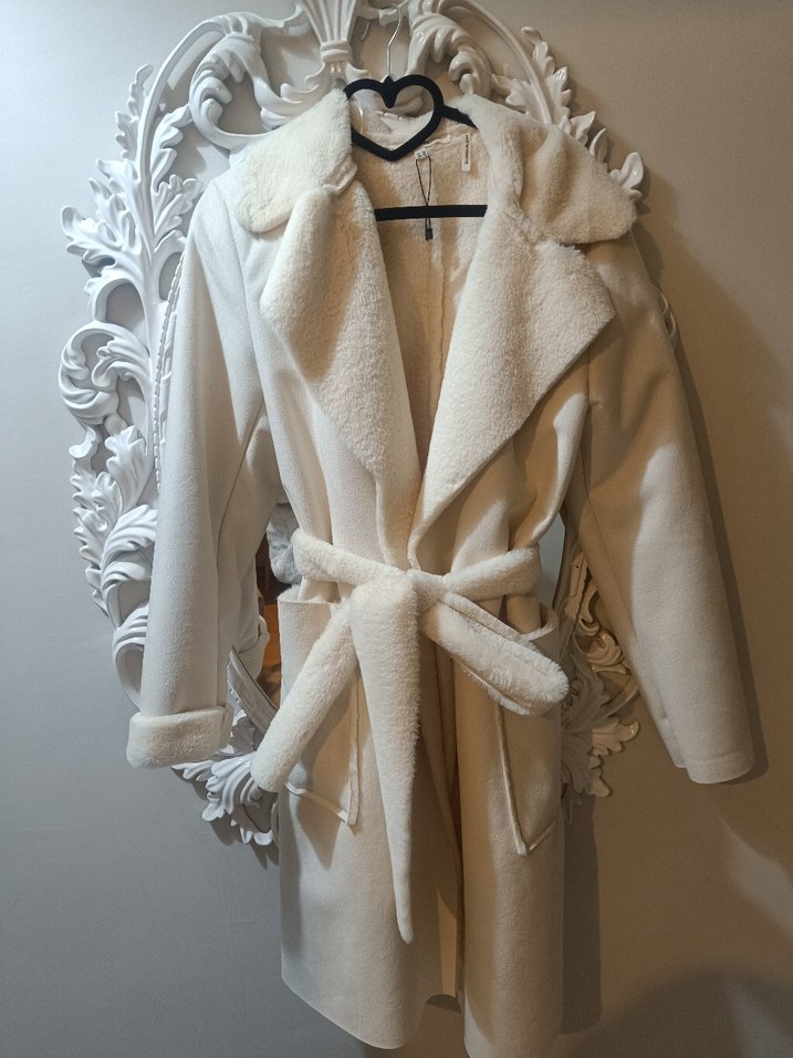 Beyaz uzun kadın kaban, kürklü detaylıdır. Notlu yaka, kemerli ve rahat kesimli, yumuşak ve sıcak kumaştan üretilmiştir.