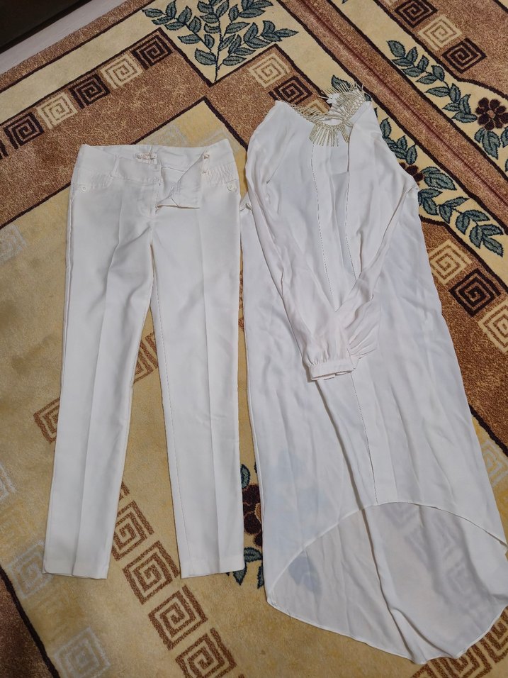 Beyaz uzun kumaş pantolon, regular fit ve ipeksi dokuyla, drapeli tasarımıyla düğünlerde şık ve rahat bir görünüm sunar.