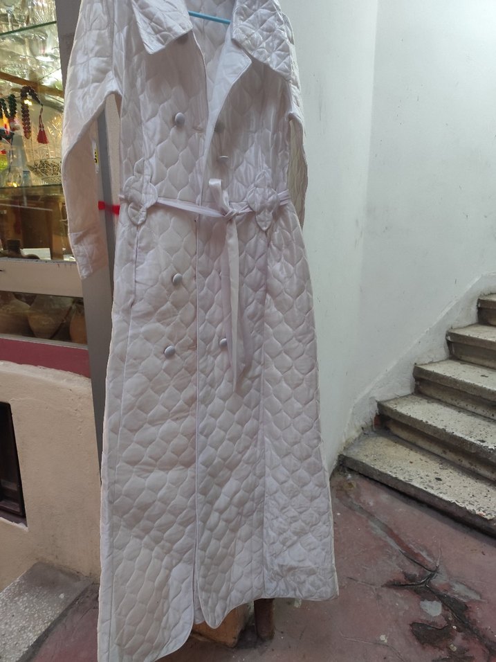 Uzun beyaz kadın sabahlık, uzun kol ve düzenli kesime sahip. Kuşaklı ve Paris esintili bohem tarzında, kapitone detaylıdır.