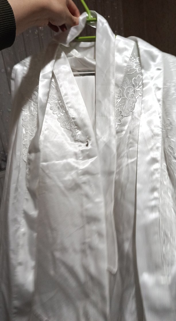 Beyaz uzun kadın sabahlık, parlak dokusu ve nakışlı yaka detayıyla minimalist tarz sunar. Strappy kollu ve regular fit kesimlidir.