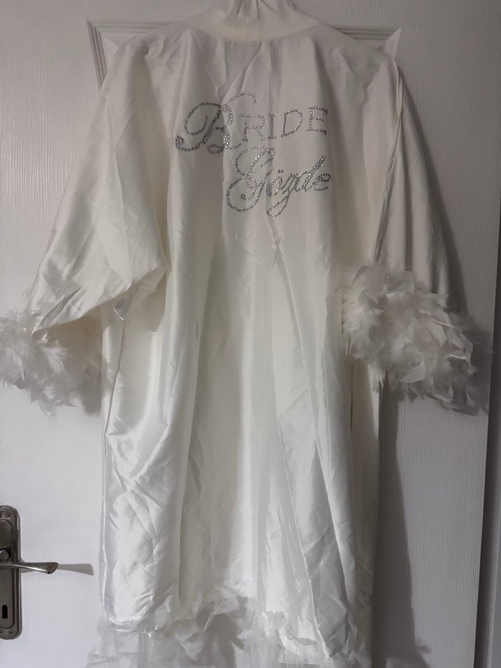 Beyaz uzun kadın sabahlık, yarım kollu ve bol kesimdir. Kollarında tüy detayları ve sırtında "BRİDE" baskısı vardır. Parlak yüzeye sahiptir. ️