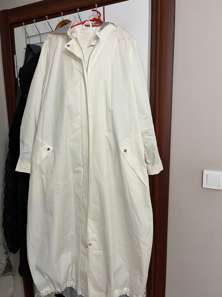Pamuk kumaştan uzun, beyaz, düğmeli ve yakalı, bol kesim kadın yağmurluk. Minimalist sokak tarzına uygun, günlük kullanıma uygun. Hediye geldi etiketi yoktur Setrems markadır