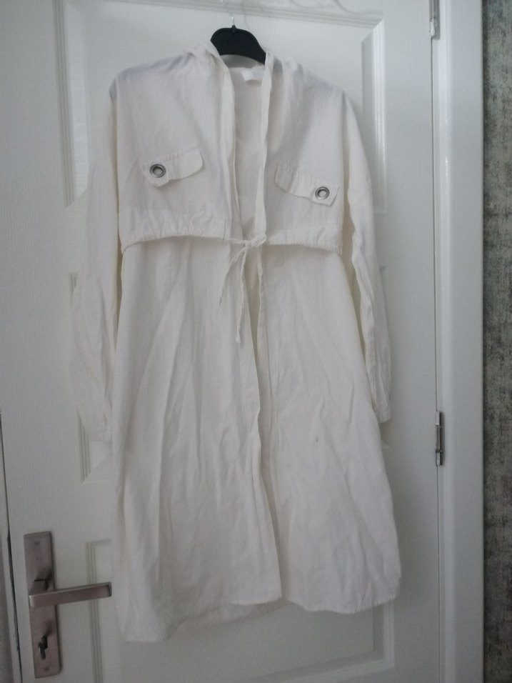 Beyaz Uzun kapşunlu saf keten trençkot, düğmeli detaylar ve kesik yaka ile bol kesim sunar, trend günlük stil için uygundur. 36 ve 38 beden uygundur.