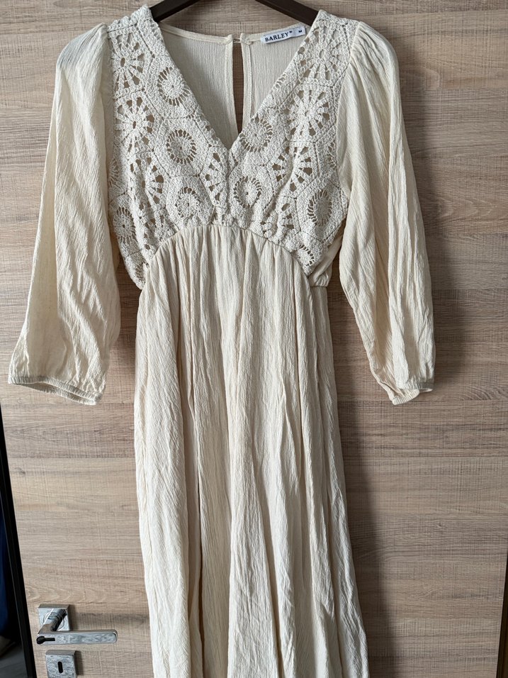 Beyaz uzun keten elbise, bol kesim ve kayık yaka ile uzun kolludur. Düğün ve gündelik kullanım için drapeli tasarıma sahiptir.