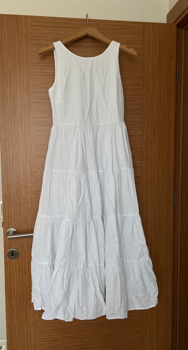 Bu beyaz uzun keten elbise, straplez yakalı, bol kesim ve fırfır detaylı bohem tarzını yansıtıyor.