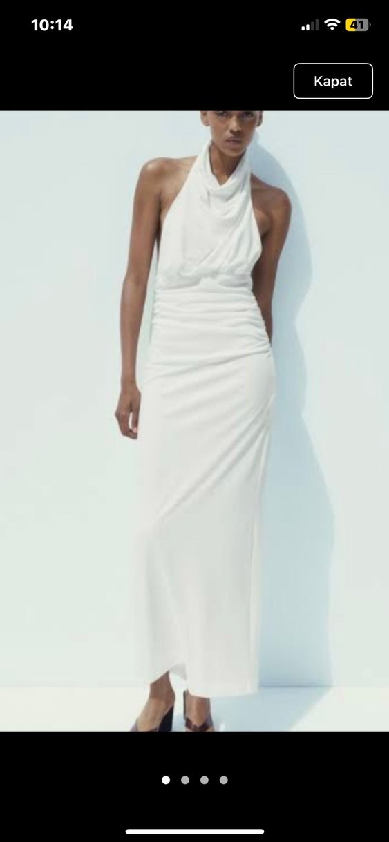 Beyaz keten kumaştan, drapeli yüksek yakalı ve kolsuz, klasik şıklıkta, uzun ve vücuda oturan elbise. 1 KERE KULLANDIM İYİ DURUMDA