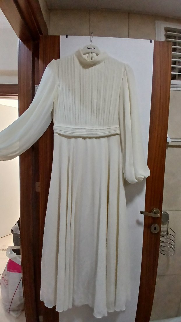Beyaz renkte, ipek kumaştan yapılmış, yüksek yakalı ve drapeli uzun elbise. Uzun kollu ve bol kesim, düğünler için uygun, vintage klasik tarzda.