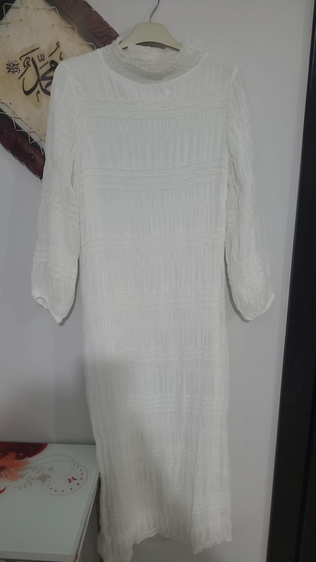 Beyaz uzun keten elbise, pilili detaylara, uzun kollara ve kayık yaka tasarımına sahiptir. Rahat kesimi ve bohem tarzıyla günlük kullanıma uygundur.