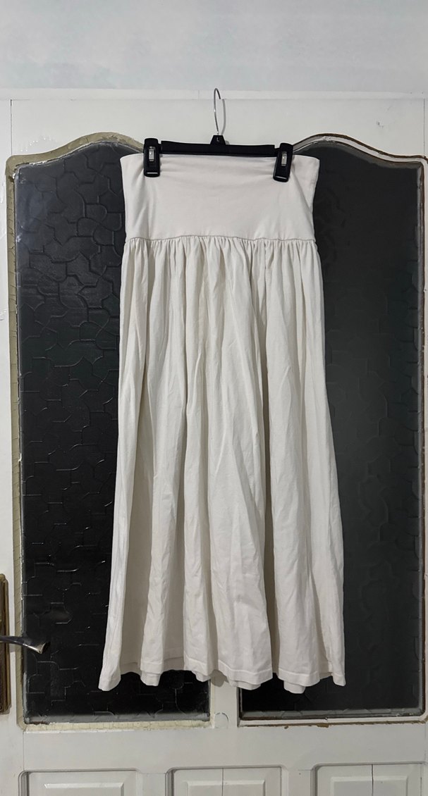 Beyaz uzun keten etek, dökümlü tasarım ve bol kesim sunar. Minimalist tarzıyla günlük kullanıma uygundur.